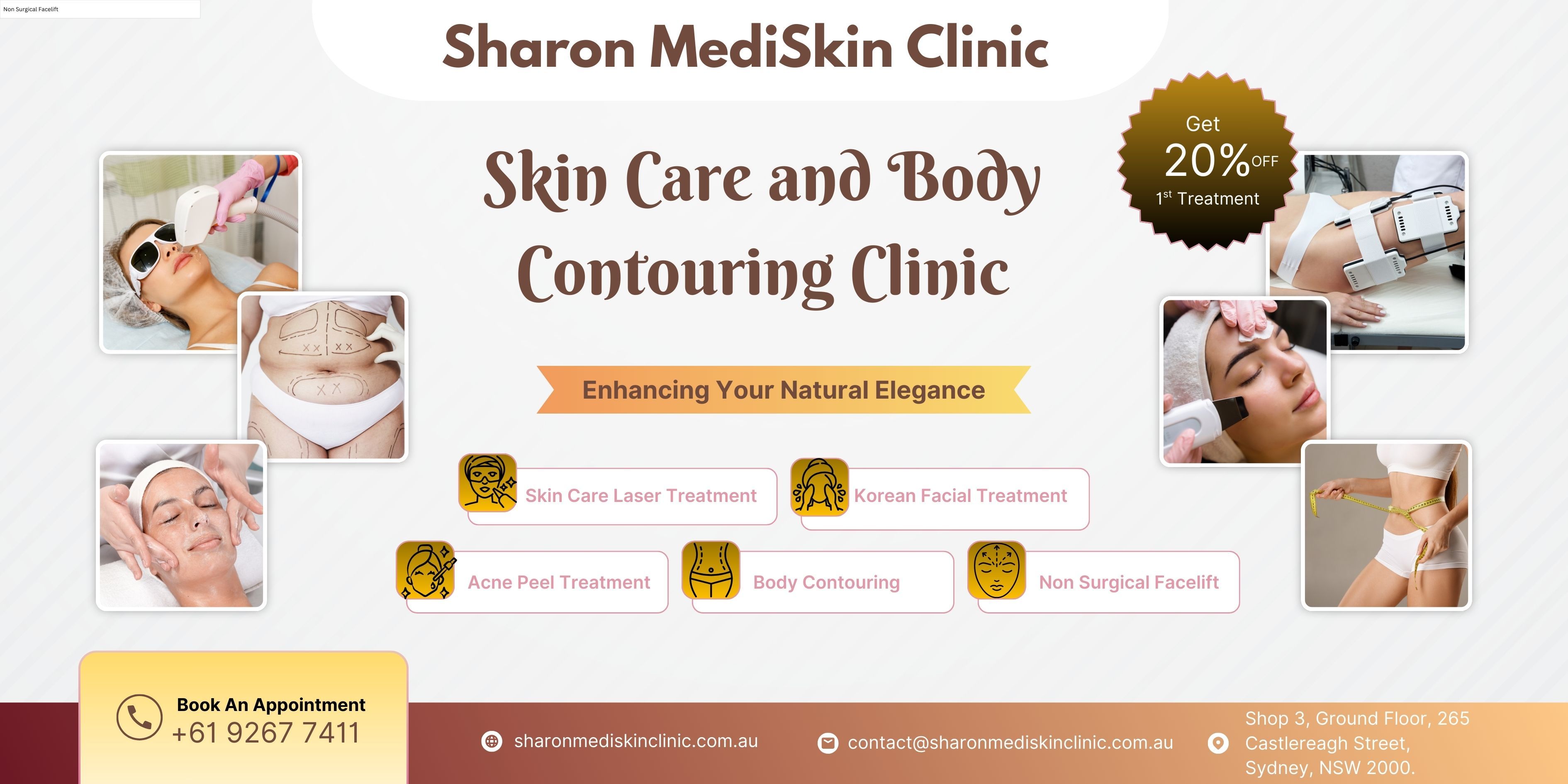 Sharon MediSkin Clinic offers advanced, non-surgical skin and body treatments designed to enhance your natural beauty. From Korean facials and skin peels to body contouring and laser therapies, our expert team tailors every treatment to your unique needs. Experience rejuvenation, confidence, and visible results in a luxurious, professional setting—where your elegance is refined with care and precision.